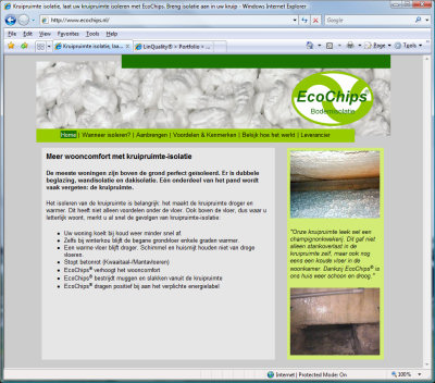 | De site is opgezet om de EcoChips nog beter te etaleren en gerichter bezoekers te trekken. Het is een kopie van de site trio-insulationchips maar met een andere naam. Beperkte informatie was al op de eigen site van Inspect BV te zien. Deze site past volledig bij de brochure van de chips. | |